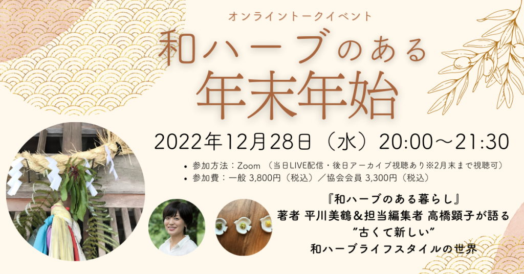 一年の締めくくりから新しい年へ橋渡すこの時期、足元の植物「和ハーブ」と暮らすヒントやご家庭での取り入れ方、和ハーブセルフケアのコツ、日本各地の植物フォークロア(民俗)の知恵をご紹介します。当日は、講師自著『和ハーブのある暮らし』(エクスナレッジ)の担当編集者・高橋顕子さんを聞き手にお迎えします。敏腕エディターだからこそ知る、著者が大切にしてきた思いや本の制作秘話、意外な和ハーブの魅力などをクロストークでお届け。年の瀬の夜、来たる一年をイメージしながら、”古くて新しい”和ハーブライフスタイルの世界をぜひお楽しみください。