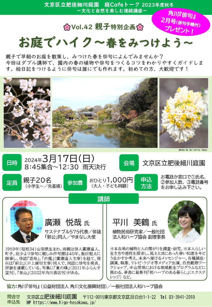 今回はダブル講師で、園内の春の植物や俳句をつくるコツをわかりやすくガイドします。
