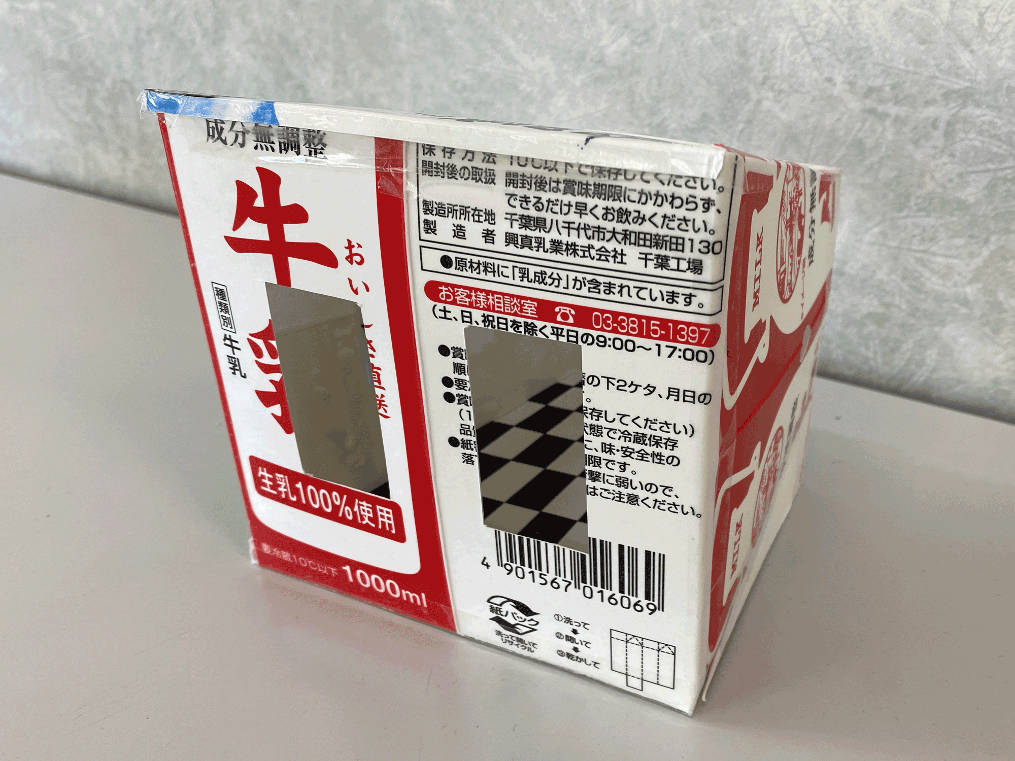 牛乳パックを使い、トリックアートBOXを作ります。同じ大きさの部屋の中で、左右の人形の大きさが変わる?!不思議な箱を作ってみましょう。