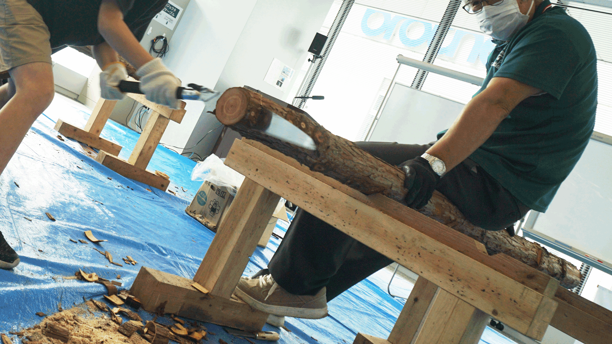 「中央区の森」の丸太切りに挑戦!自分で丸太を切って、飾りつけをしましょう。