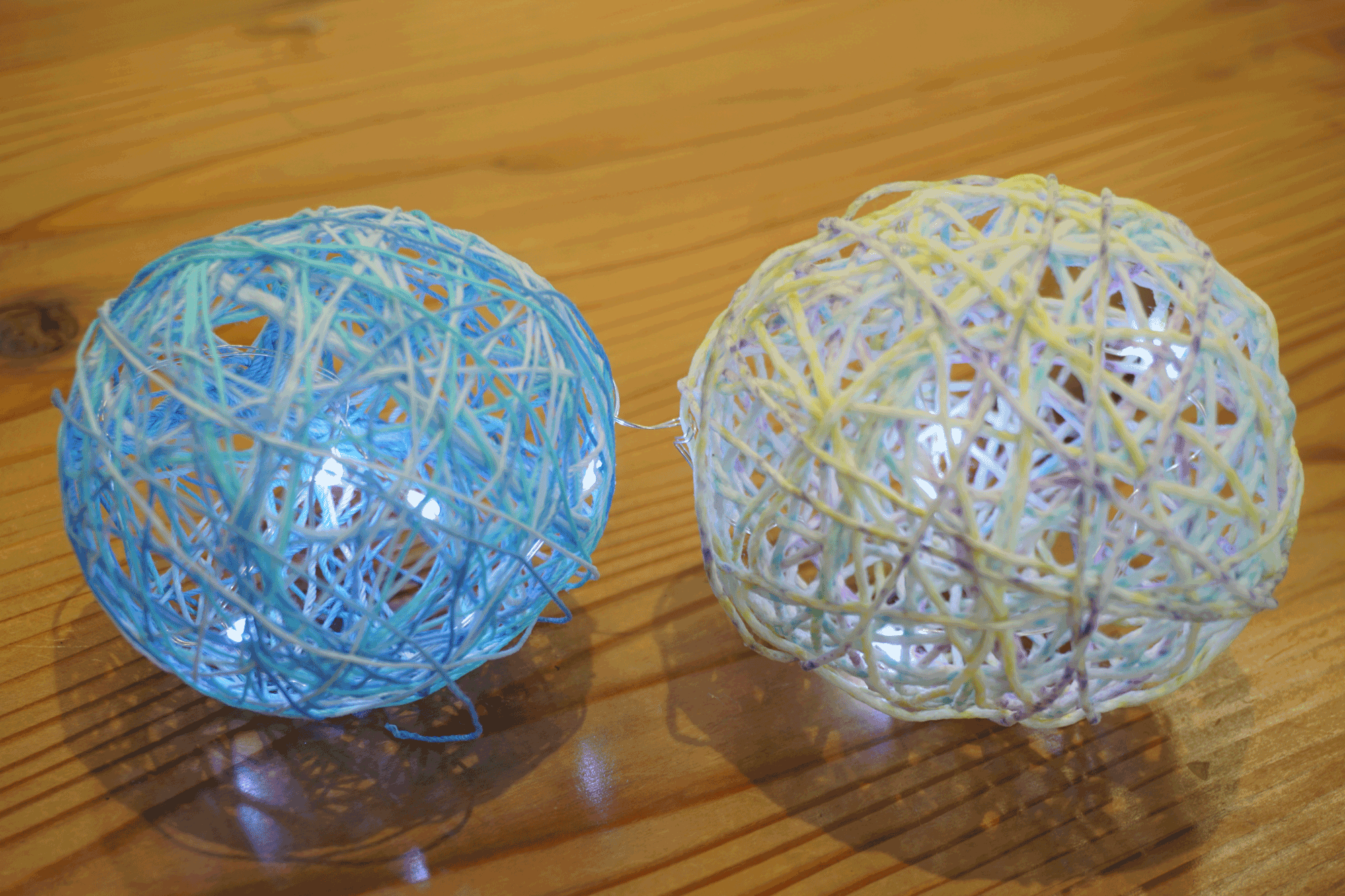 余った糸を使って、コットンボールライトを作ります。様々な色の糸を組み合わせて、オリジナルのライトを作りましょう。