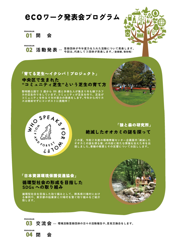 環境情報センターに登録し、さまざまな分野で活動している環境団体による今年度の活動発表と意見交換会を行います。