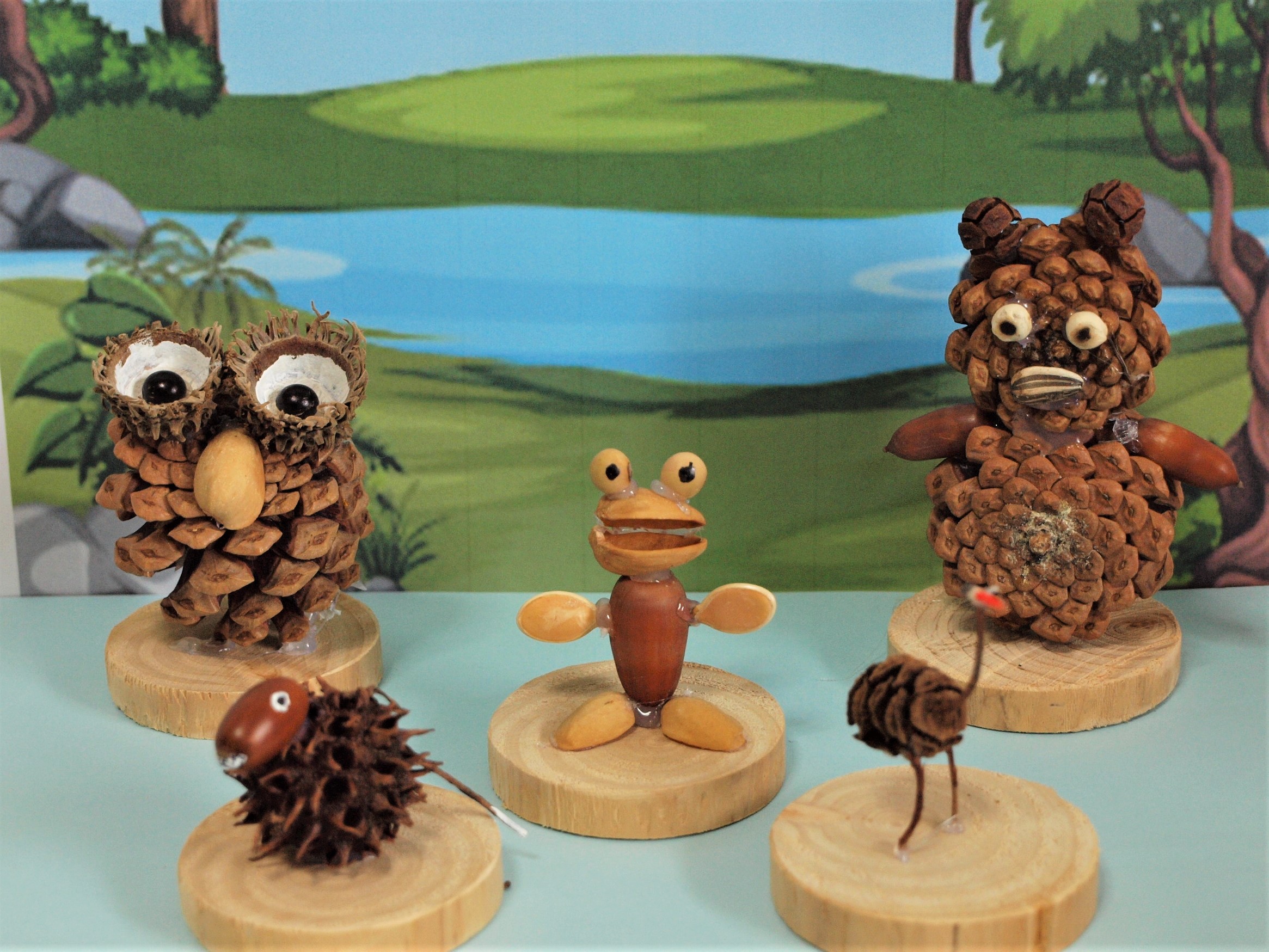 どんぐりや松ぼっくりなど自然の素材を使って、熊や鳥などの動物を作ります。自分で作った作品はお家に飾りましょう。