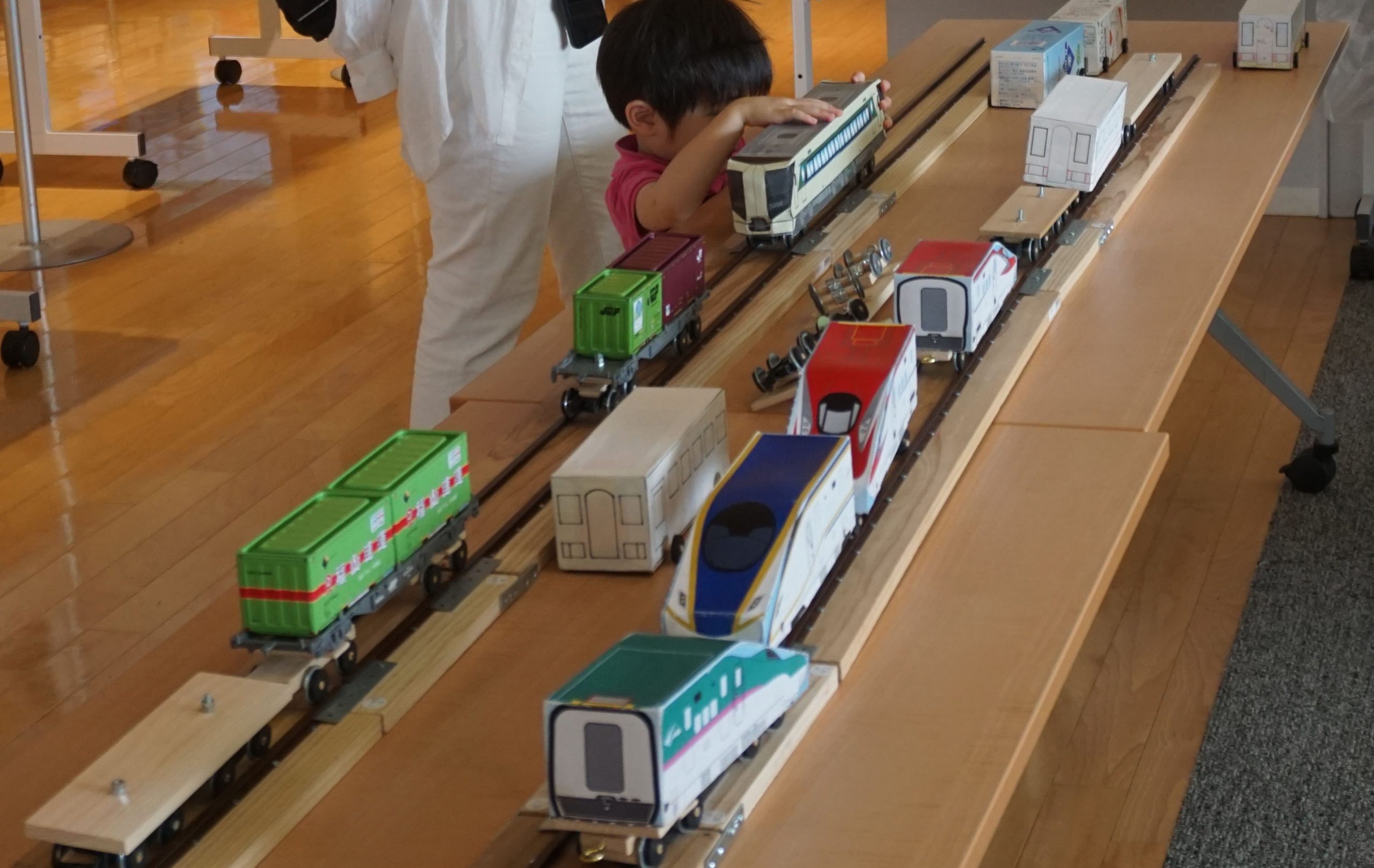 自分で作った牛乳パック電車を走らせてみましょう。午前中の講座に参加していない方も体験ができるのでぜひご参加ください。