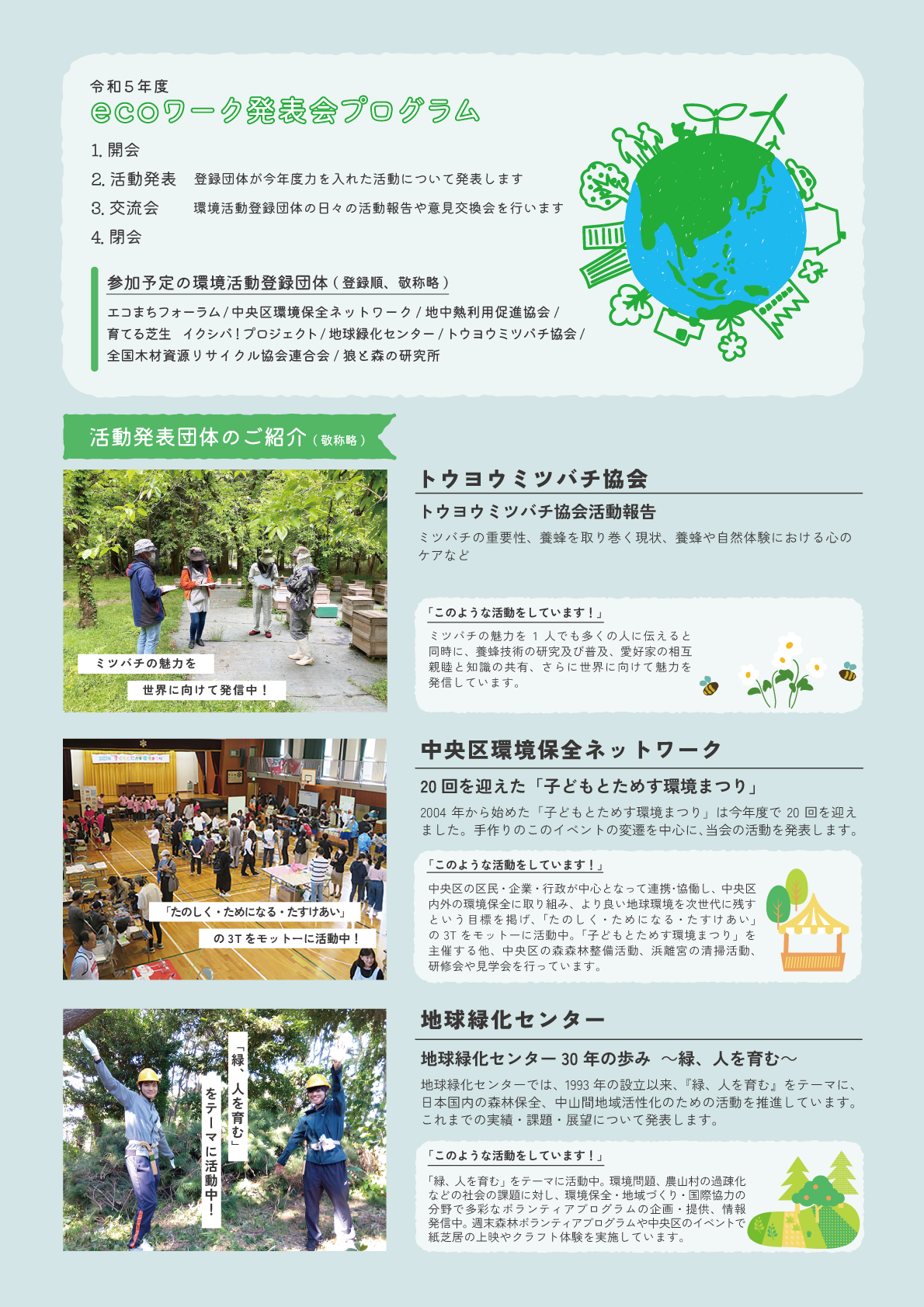 環境情報センターに登録し、さまざまな分野で活動している環境活動団体による今年度の活動発表と意見交換会を行います。