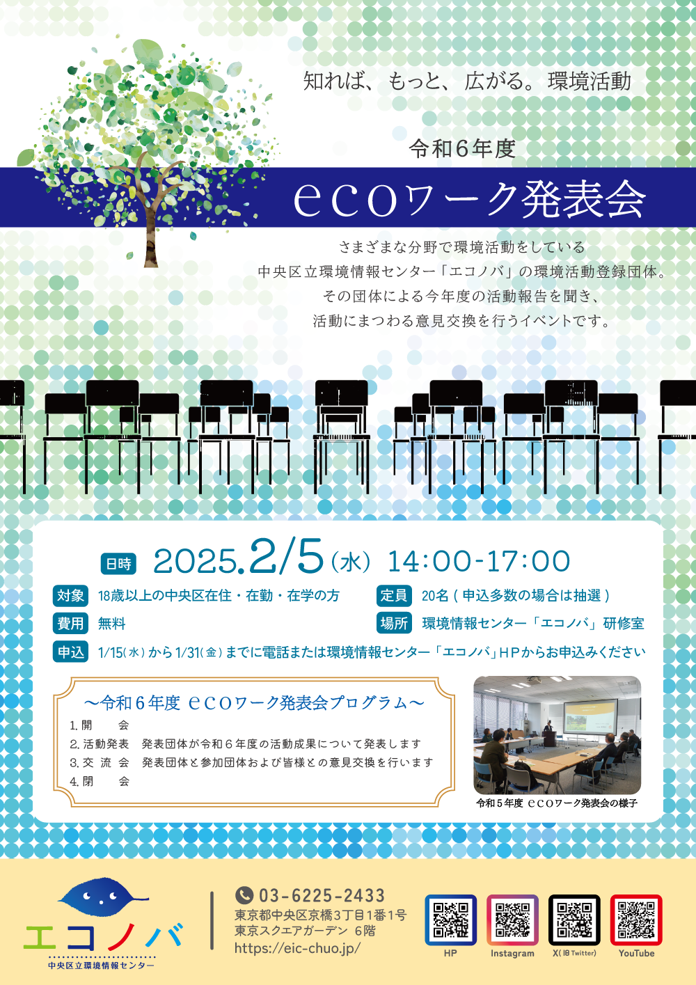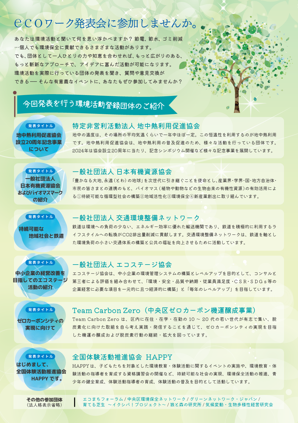 環境情報センターに登録し、さまざまな分野で活動している環境活動登録団体による今年度の活動発表と意見交換会を行います。