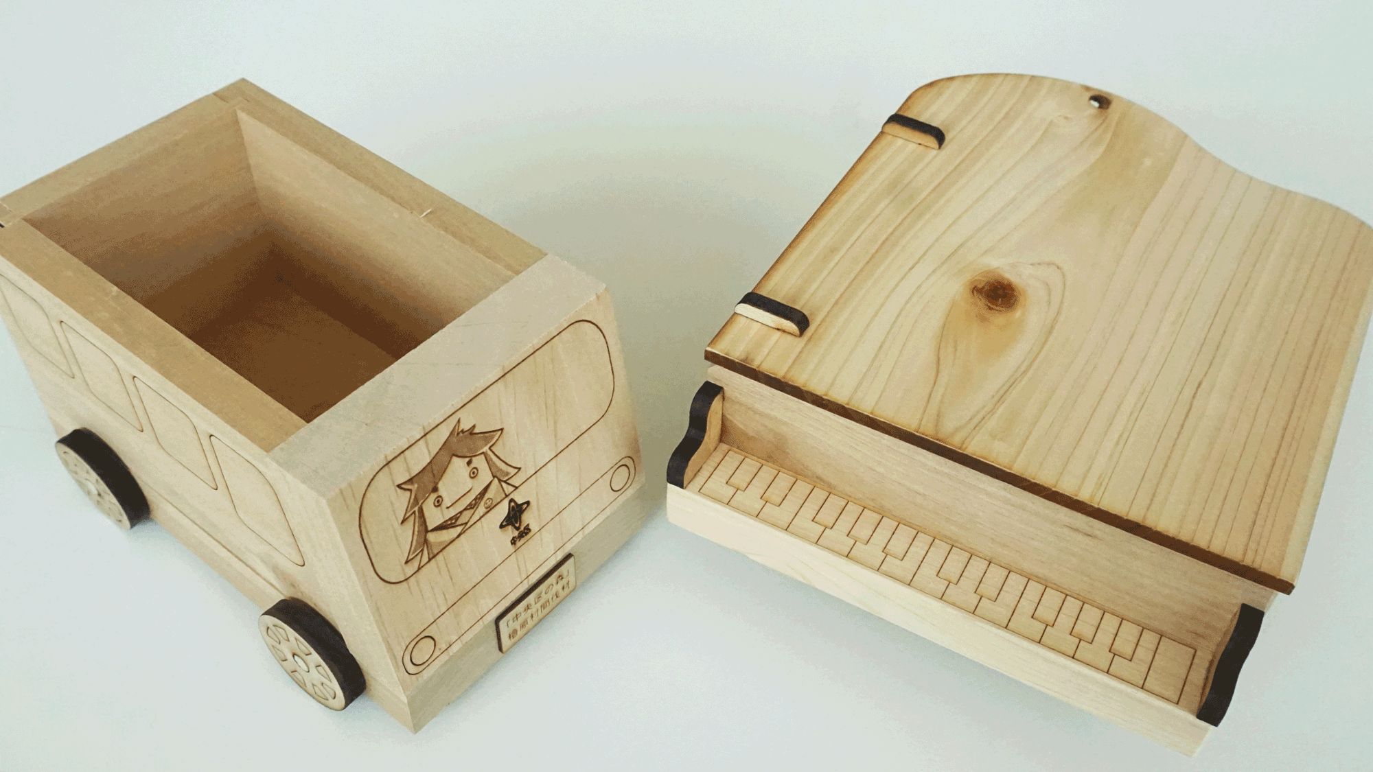 「中央区の森」間伐材からできた工作キットを作ります。 今回は、小物入れにもなるバスとピアノのセットが作れます。