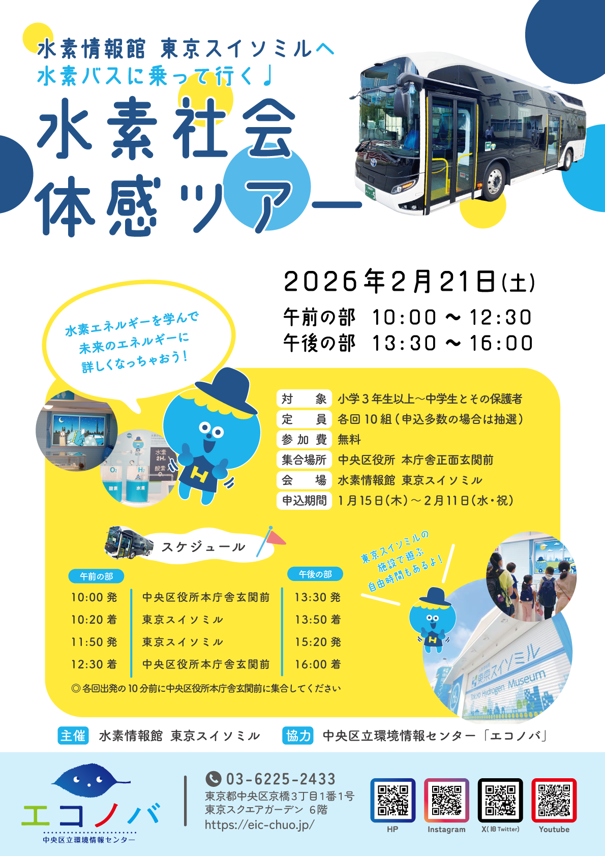 このツアーでは、中央区役所前から東京スイソミルに水素バスで行きます。東京スイソミルでは、水素エネルギーや、水素から電気を作る水素発電の仕組み、水素で動く車「燃料自動車」に水素を入れる「水素ステーション」などについてくわしく知ることができます。また、自転車を使って水素を作る体験をすることもできます。