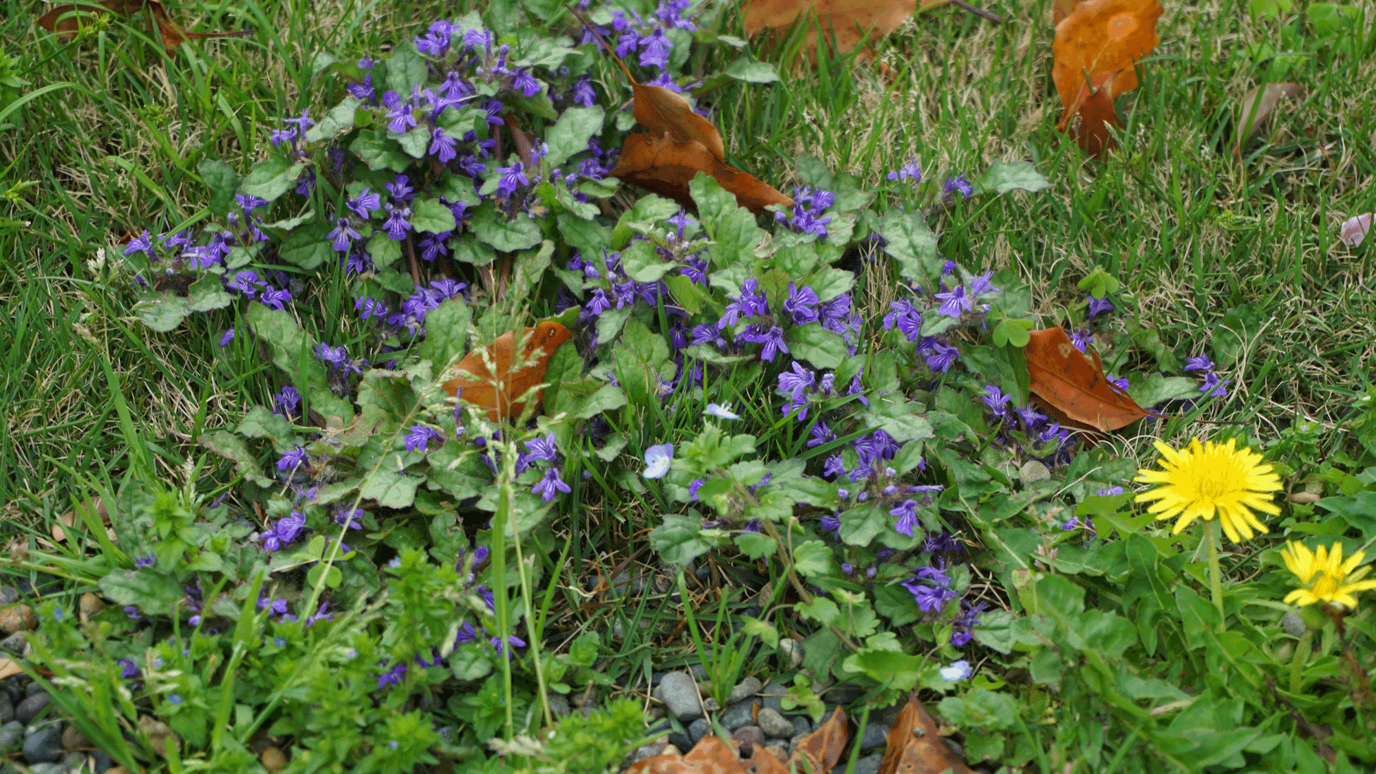 紫色の花はキランソウ。(黄色はタンポポ)