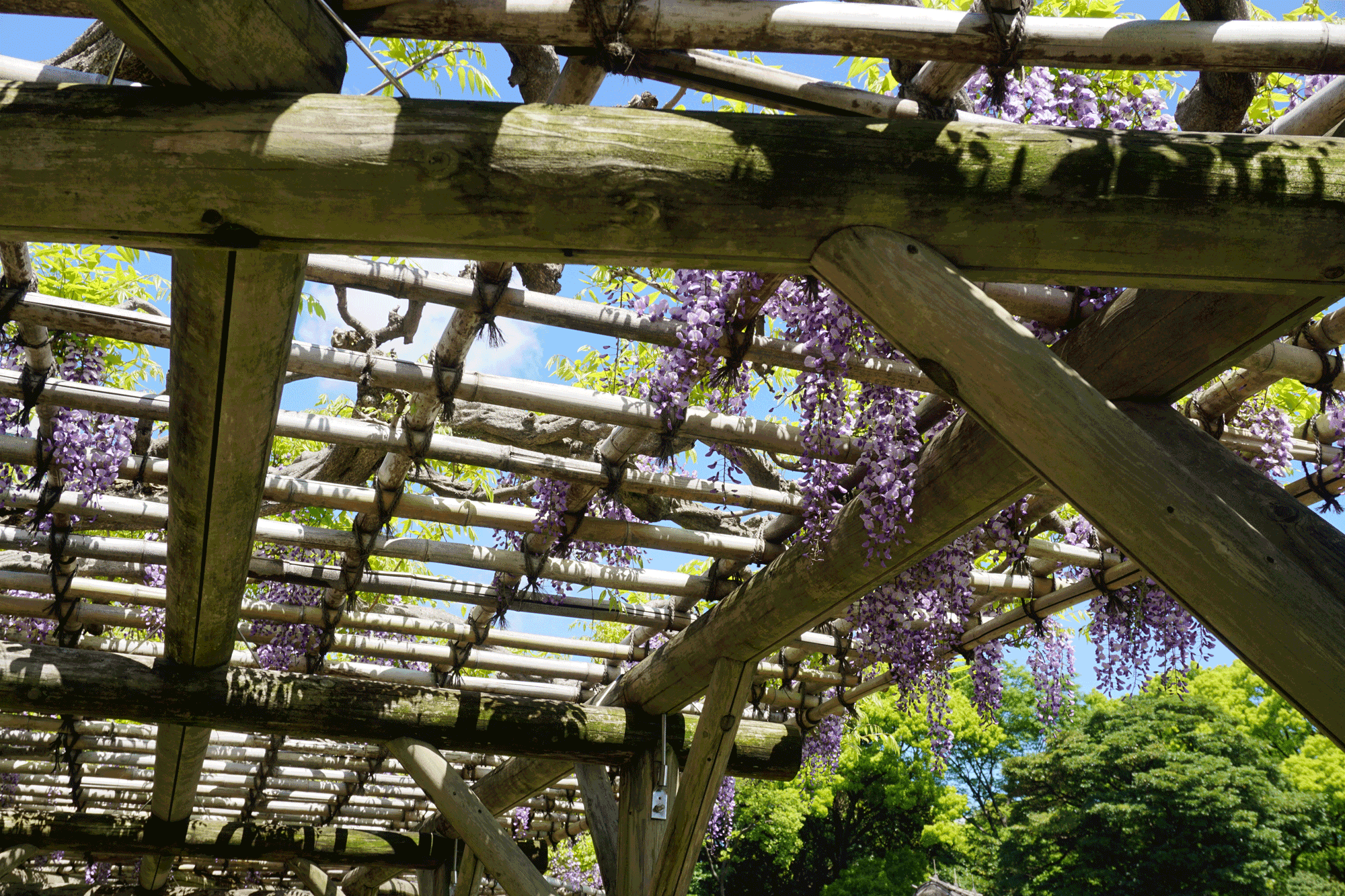 藤棚ではフジが花をつけています。