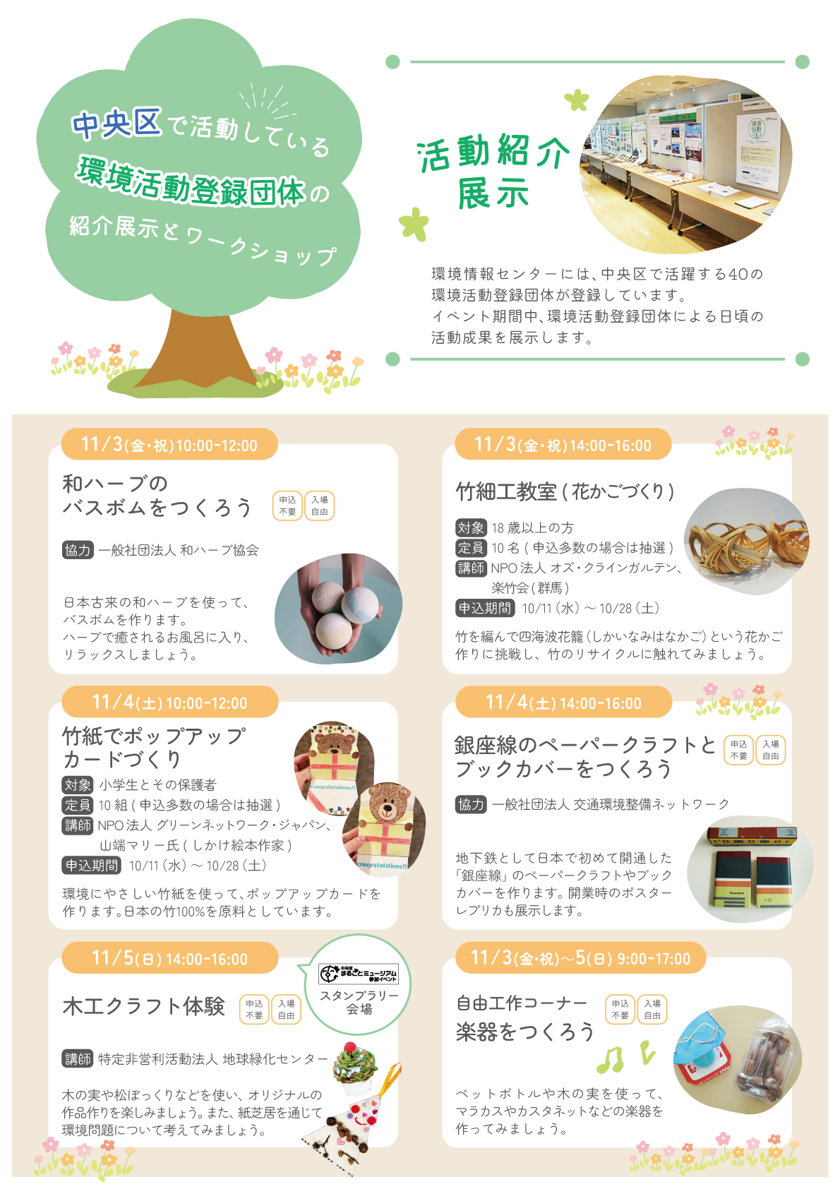 環境情報センター「エコノバ」に登録している、環境活動登録団体による日頃の活動成果を展示します。また、環境活動登録団体の協力によるさまざまな講座を実施します。